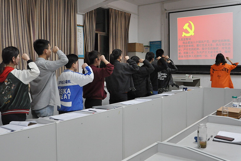 此次大会主要讨论王聘、谭娜、吴常、江钰、左阳、郑晗、唐秀雯、李腾、阳刘中共十一名入党积极分子的发展问题,旨在吸纳优秀教师、学生,壮大党员队伍,为支部将来的发展打下坚实的基础。大会在庄严的国际歌中拉开了序幕。根据大会议程,首先由入党积极分子依次宣读入党志愿书并介绍个人履历。大家都态度真诚地表达了自己对党的热爱向往,都表示自己将坚定不移跟党走、为党的工作付出自己的力量、为共产主义事业奋斗终生。每位积极分子发言之后,各对应的入党联系人对其学习、工作、实践活动等方面进行发展期间的考核观察评价汇报,并对其能否入党表明自己的态度。然后学生思政组织代表党支部宣读综合考察意见,积极分子们暂时回避,由正式党员对申请人能否入党进行讨论并开展无记名投票。经大会讨论,最终9名发展对象得到了全体与会党员的一致认可,全票通过。同意吸纳此9名同志成为中共预备党员。9名同志在李芳老师的带领下握拳宣誓。最后,商学院党总支部书记储昱同志作了大会总结发言。她首先对此次发展的9位同志表示祝贺,其次希望这9位同志今后能严格按照共产党员的标准要求自己,不断地完善党性修养,积极参加党支部组织的活动,克服自己的缺点和不足,以实际行动争取早日成为一名正式共产党员。
