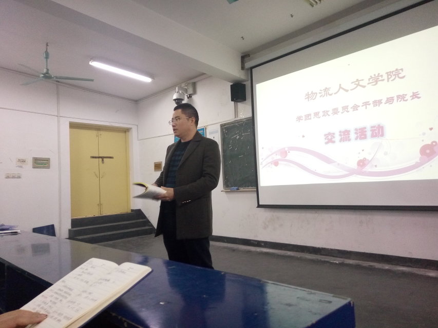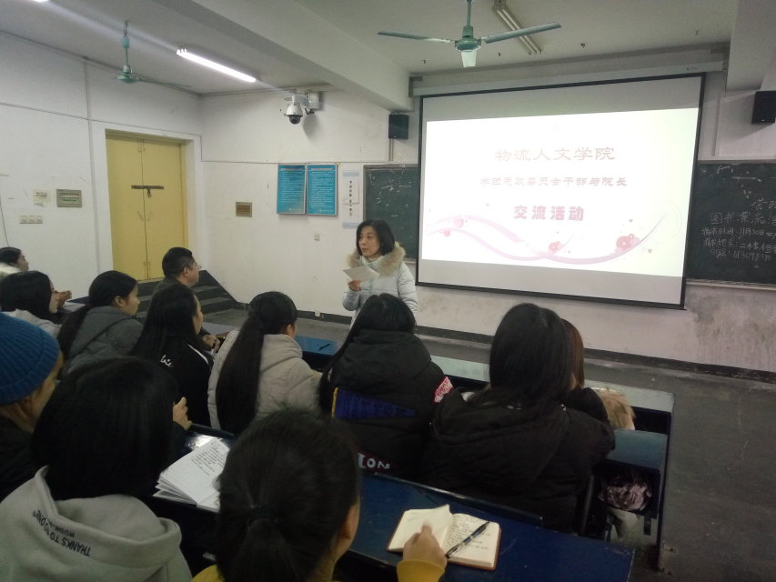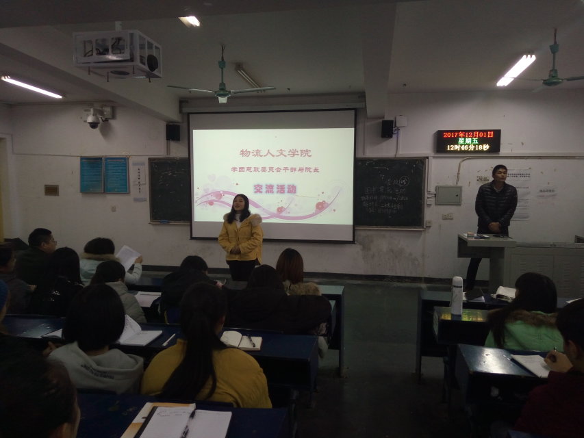 2017年12月1日中午,物流人文艺术学院第一届思团学干部与院长交流会在教学楼400教室隆重举行。物流人文艺术学院党总支书记、院长刘淑一,党总支副书记、副院长蒋兴君,学生干事汤愿,团总支书记陈玮参加本次交流会,交流会由学生干事汤愿主持。