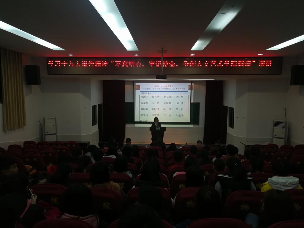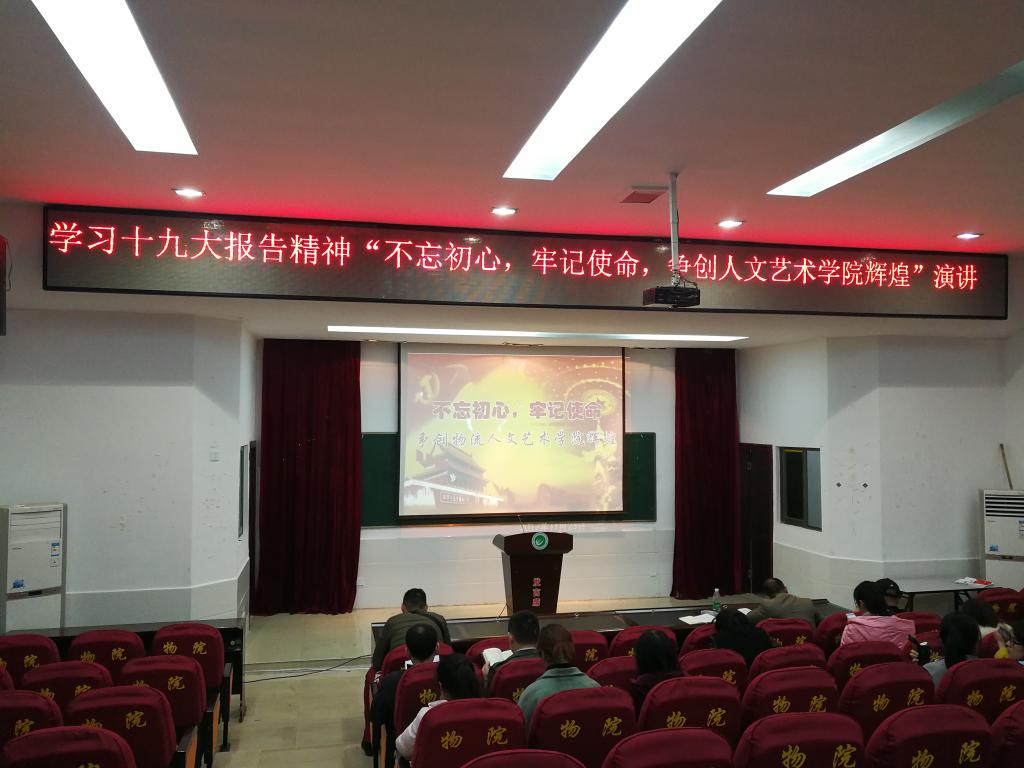 2017年11月22日晚,物流人文艺术学院党总支在学校图书馆一楼学术报告厅举行学习十九大报告精神“不忘初心,牢记使命,争创人文艺术学院辉煌”主题演讲。参加此次演讲的为我院党员,刘淑一、蒋兴君、姚济国、唐彪、李翠琴、汤愿、周晓霞、陈玮、戴丽娟、赖永晖等17名老师依次上台演讲。我院所有入党积极分子和有意向向党组织靠拢的学生到现场聆听本次演讲。