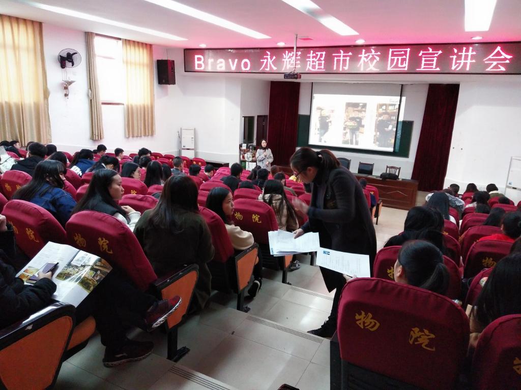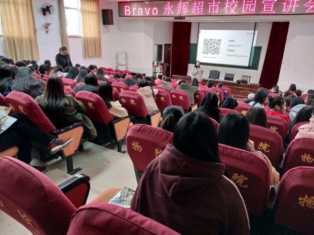 永辉其门店分布于沿海地区,2018年有进军长沙的准备,这也为我院不想离家太远的同学提供了机会,公司有专门的微学院培训平台,对入职员工进行培训,平台还可以直播上海的专场培训,员工入职后可享受五险一金的待遇,企业更是推出了“重磅福利”,一旦成为他们的储备合伙人,公司会在上海提供住房。永辉Bravo店由众多的小店组成(如休闲小店、干果小店,果蔬小店等),小店采用合伙人方式,小店合伙人与平台合伙人有着可观的月收入,许多同学对该企业产生了浓厚的兴趣,并现场进行了交流,很多同学对自己想要了解的问题作了现场提问,贾女士也一一解答。宣讲会取得很好的交流效果。