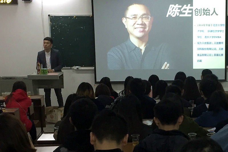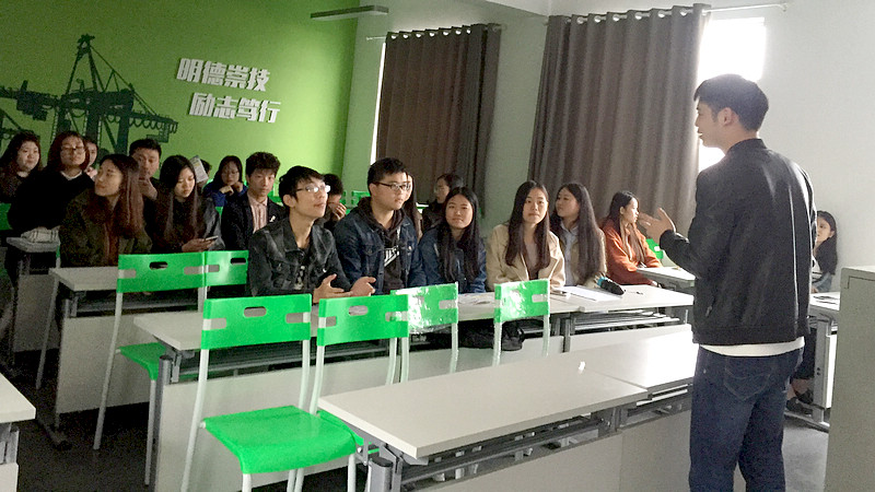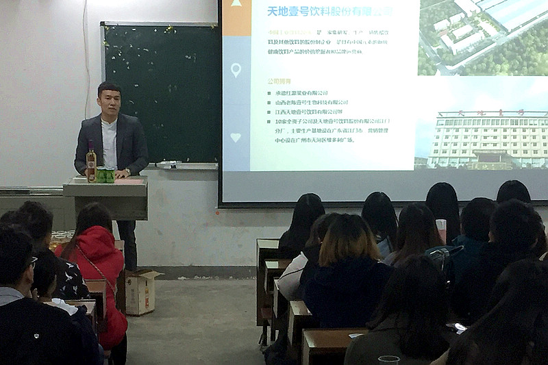 2017年11月14日下午,物流商学院成功举办的“天地壹号饮料股份有限公司”的专场招聘会。主要招聘营销人员。商学院辅导员熊英老师亲自带领营销1501班和1502班全体同学,参加了在教学楼114举办的“天地壹号饮料股份有限公司”的招聘会。在招聘会上,公司播放了新进员工成长小视频,详细介绍了招聘岗位、薪资待遇、年终奖金等,以扩职业发展方向、晋升通道等。