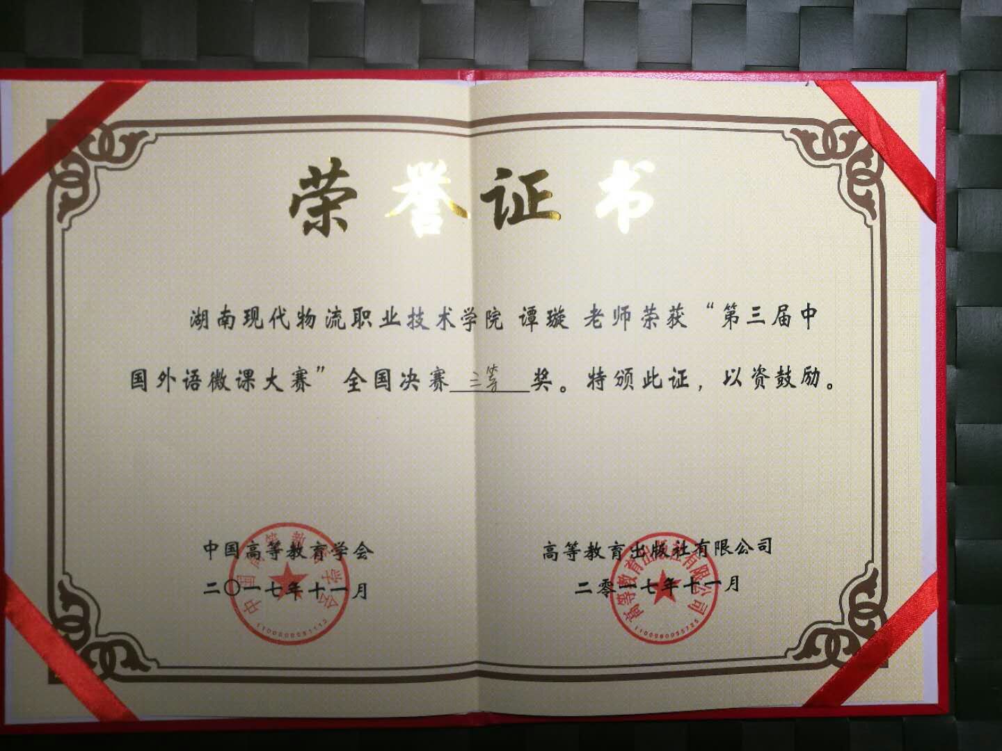 2017年11月2日,第三届中国外语微课大赛全国总决赛于南京举行。9999js金沙老品牌物流人文艺术学院谭璇教师荣获第三届中国外语微课大赛湖南赛区一等奖、全国总决赛三等奖的好成绩。