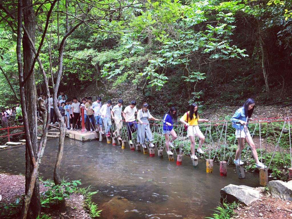 水上漂流还意犹未尽,同学们又向素拓登山出发!“木板桥”、“秋千桥”、“木桩桥”......一个个刺激的登山障碍也没有让同学们萌生退意,灵活的穿梭在这丛林间。