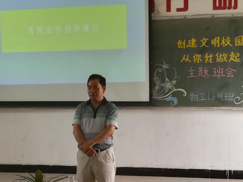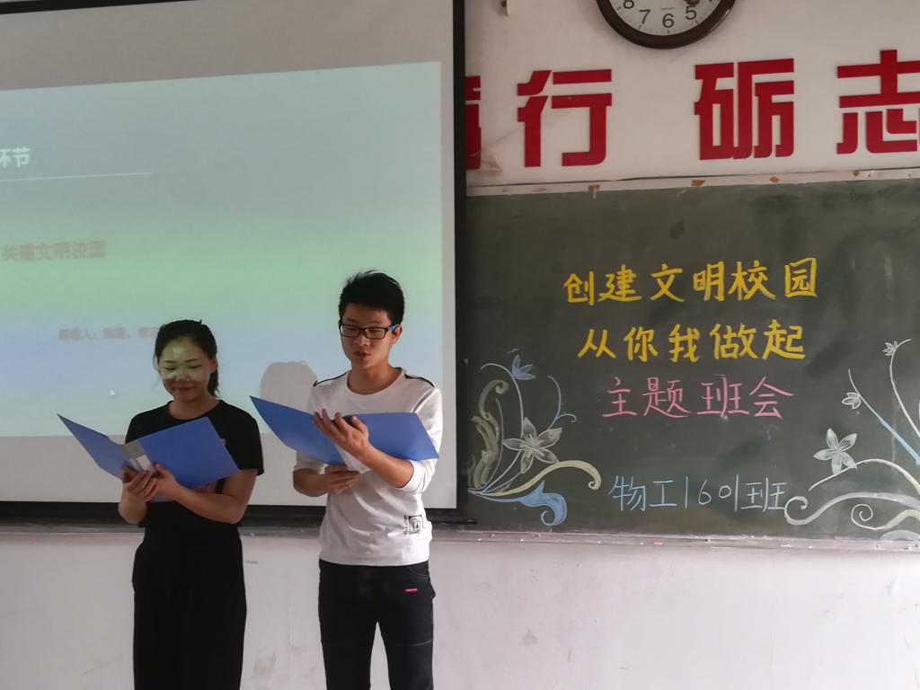 为营造积极向上、文明礼貌、舒适优雅的校园文明环境,倡导学生争做文明学生、共创文明校园,响应学院文明主题班会活动,物工系物工1601班组织的“创建文明校园,从你我做起”主题班会于2017年6月2日下午2:30在教学楼408教室举行,此次班会由肖智清副院长担任评委,辅导员高琪昕老师到场。