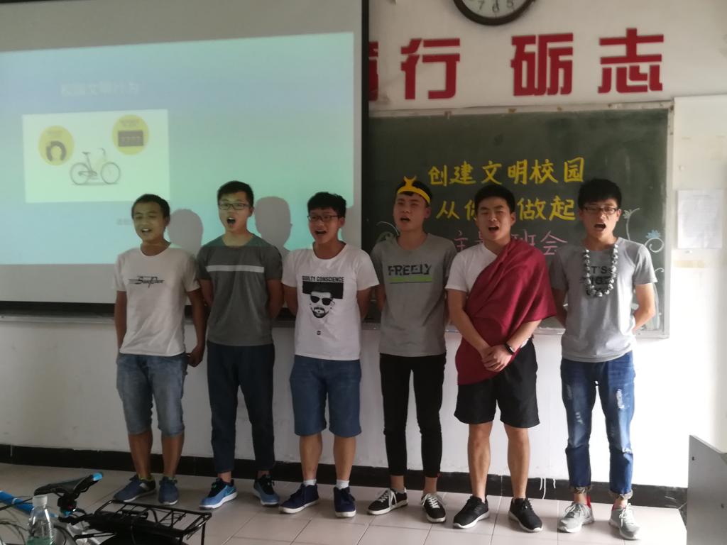 接下来的场景剧“共享单车”更是把班会氛围调向了高潮。紧接着,文明礼貌相关视频的播放,又加深了大家对文明的深刻认识。“你说我猜”的趣味游戏以寓教于乐的形式让同学们温习了校训、学到了几个文明典故。游戏过程中气氛活跃,掌声不断,每个同学都积极踊跃的参与进来,充分表现了活动中“从你我做起”的人人参与的主题思想。最后,在班级助理辅导员陈建、唐志敏的朗诵中班会接近尾声。在学长学姐的带领下,全班同学一起进行了庄严宣誓,字字认真、句句铿锵有力,争做文明大学生的决心让全班为之振奋。