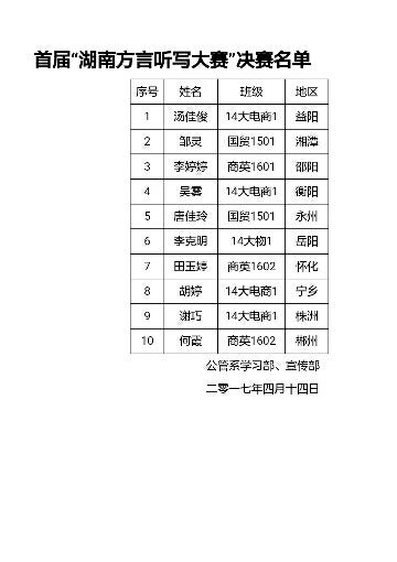 由公共管理系学习部与宣传部共同举办的系部方言听写大赛于2017年4月10日晚7点在教学楼100举办复赛,此次复赛由公管系主席王康主持。进入复赛的三十名选手,她们均从初赛的队伍中脱颖而出。精彩的初赛还让人记忆犹新,本次又迎来了激烈的复赛对决。