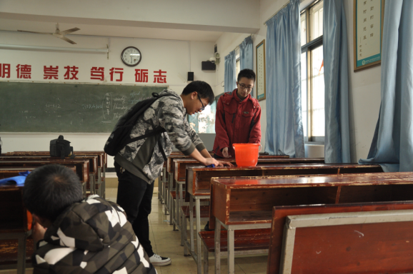 活动开始前,各系团学会在主席台集合领取所需要的工具以及分配好各系所负责的区域。紧接着,田径场、教学楼第四层处处可见物工系学生干部忙碌的身影,一个个努力清洁墙上、地上、甚至是桌案内部的脏物。在打扫卫生的时候,很多牛皮癣广告都粘贴的非常牢固,学生干部们用铲子、刷子等工具认真的把墙上的牛皮癣刷干净,仔细的把教室里的垃圾清理干净,就连桌子上、门上的小广告也不放过,虽然小广告极难清理,但团学干部们发扬了不怕脏、不怕累的精神,教室环境得到了明显改善。