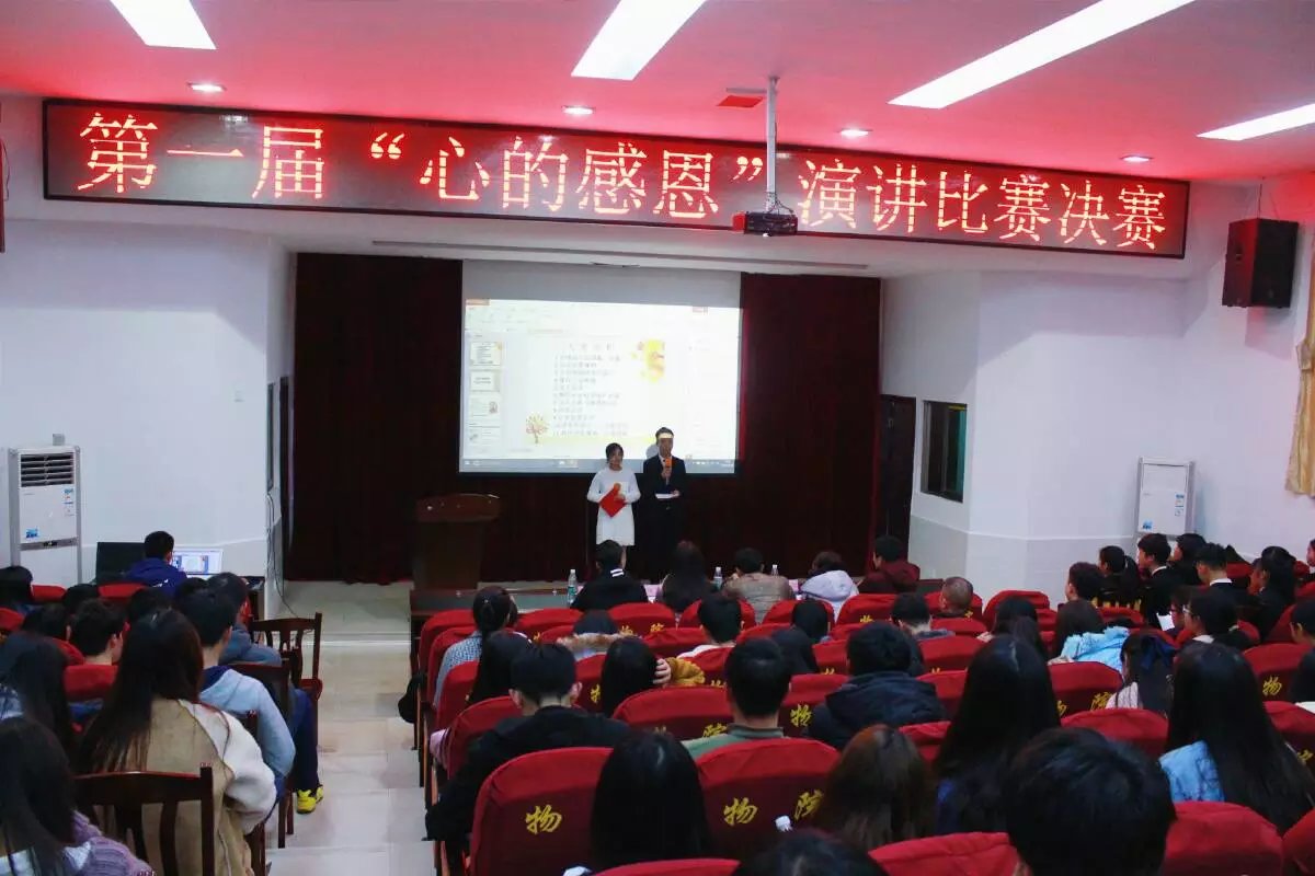 2016年12月18日晚上,物管系学生会心理健康部在学术报告厅举办了一场新颖而有意义的以“心的感恩”为主题的演讲比赛,邀请了物管系学生会主席黄滔,副主席曾晓文、唐宁,物管系团总支副书记张思恩,专职常委曾琦担任本次比赛的评委。此次演讲比赛秉承着“弘扬感恩之心”的主旨,提升大学生对感恩的深刻认识。