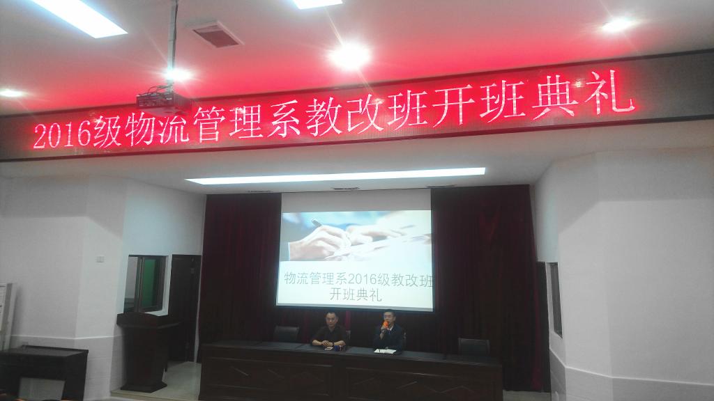 2016年10月11日,物流管理系教改1601班开班仪式在图书馆一楼报告厅召开。物流管理系系主任陈建华、副主任段圣贤出席了开班仪式,仪式由物流管理系专职教师兼该班辅导员周礼主持。