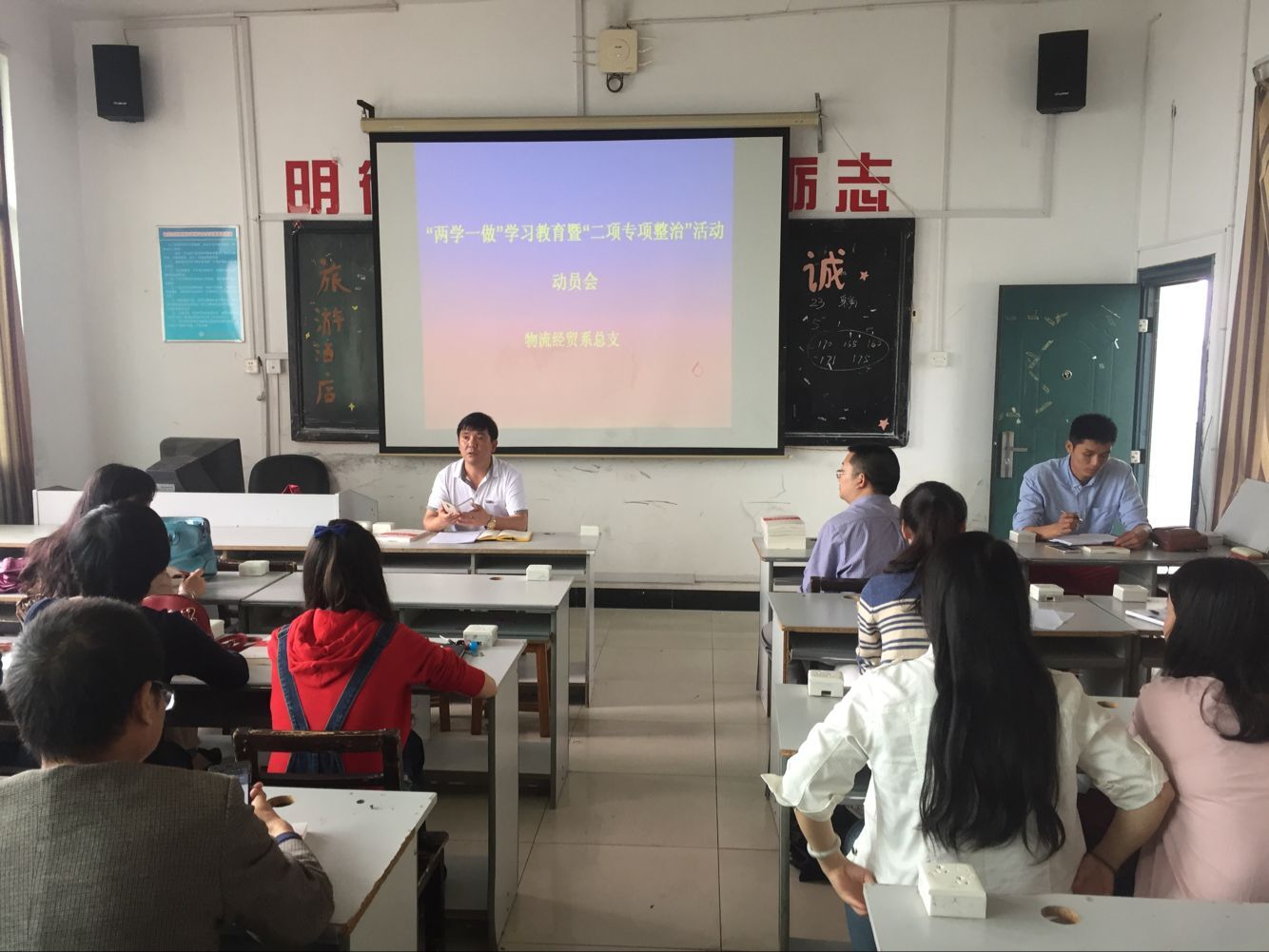 2016年5月20日中午12点40分,物流经贸系党总支“两学一做暨两项专项整治”学习教育动员大会在科技实训楼504教室隆重召开,总支书记刘意文同志主持会议并作了动员报告,物流经贸系全体教职工党员及学生党员参加了会议。