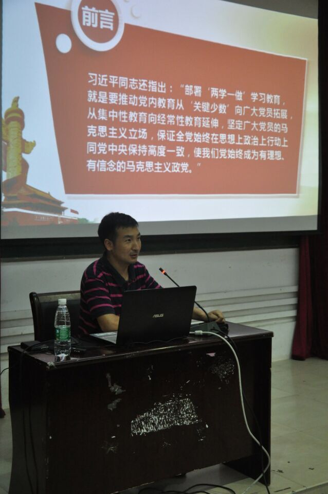 本次学习教育过程中,梁书记分别从开展“两学一做”学习教育的重要意义,党章党规,学系列重要讲话以及怎样做合格党员四个方面讲述了学习“两学一做”的重要性和物工系学生党支部“两学一做”学习教育实施方案具体安排。