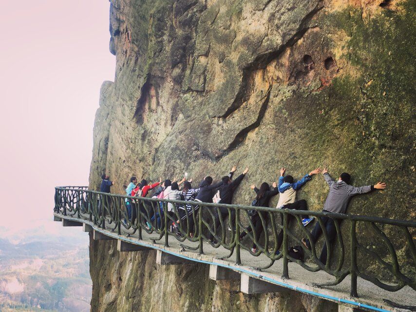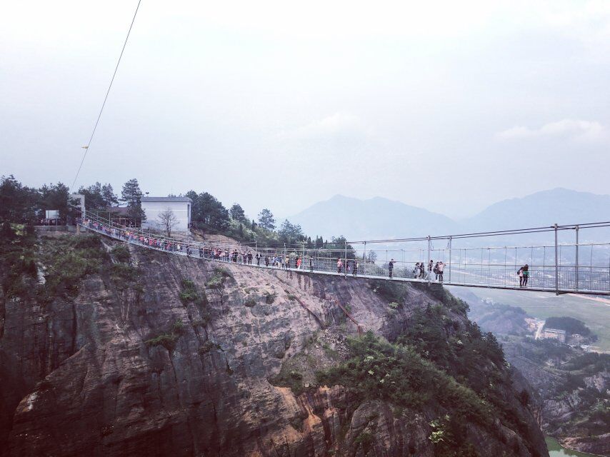 大家最期待的是透明高空玻璃桥,玻璃桥长约300米,垂直高度达180米,是目前国内跨度最大、垂直高度最高的玻璃桥,以奇险、刺激著称,故又名“好汉桥”。在等待过桥的时间下起了雨,但丝毫没有改变我们过桥的激动心情。