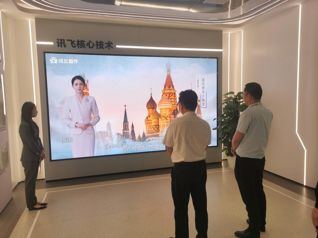 其后,在工作人员的带领下,龙吟一行参观了科大讯飞展览馆,进一步了解了科大讯飞在虚拟人物、实时翻译、AI教育等方面取得的成果,丁晓磊在介绍各项科技产品的同时,将行业发展方向与当下就业环境相结合,分享了人工智能领域的广大发展前景。