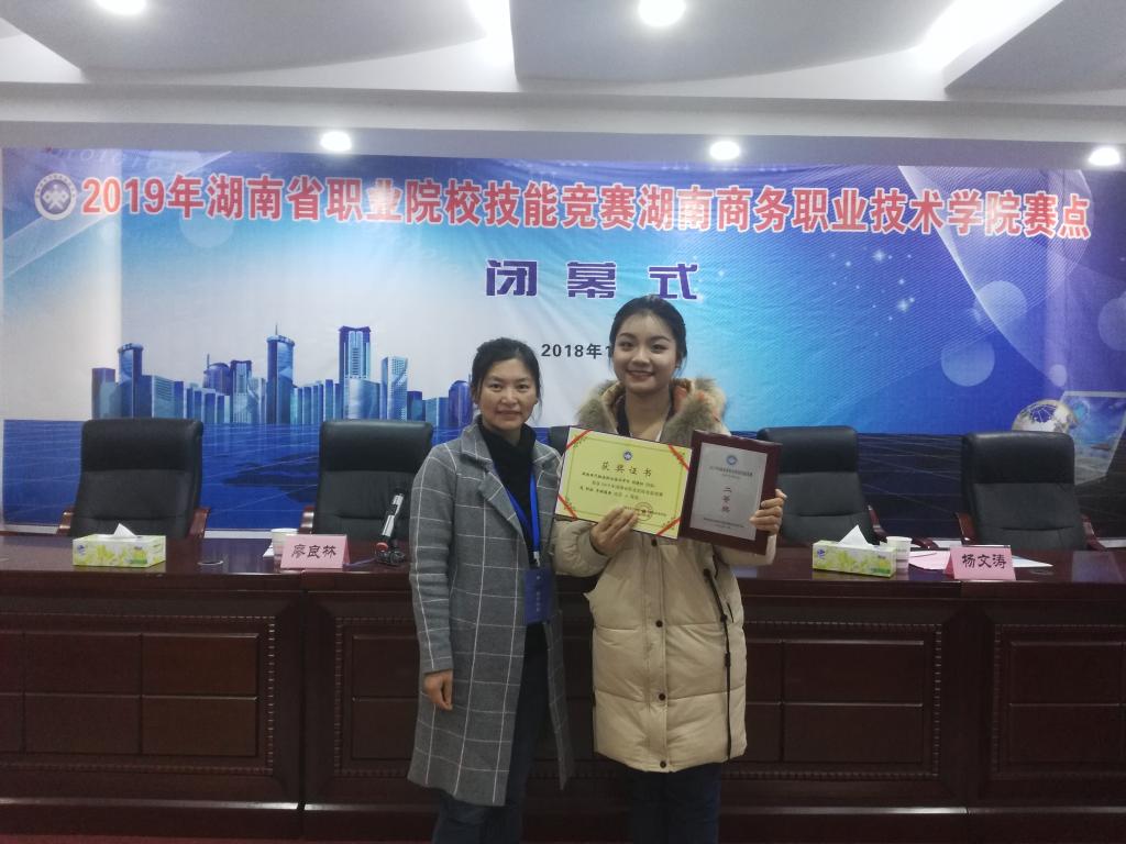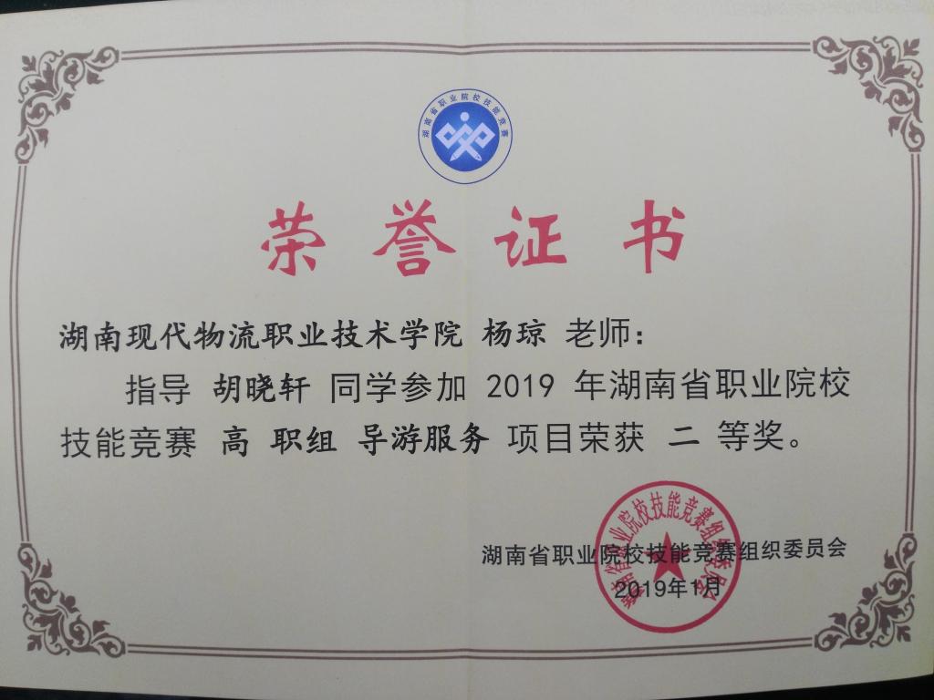 2018年12月21日至23日,2019年湖南省职业院校技能竞赛——高职组导游服务项目在湖南商务职业技术学院举行。本赛项共有来自全省31所高职院校旅游大类优秀选手86人参赛。经过三天两夜的激烈比拼,9999js金沙老品牌杨琼老师指导的胡晓轩同学(旅游1801班)荣获二等奖佳绩。