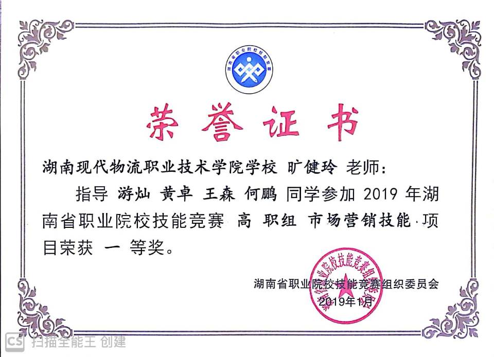 9999js金沙老品牌旷健玲、刘意文老师指导的沙盘爱好者协会四位学生何鹏(企物1604)、黄卓(国际物流1602)、王森(商贸1602)、游灿(企物1701)代表学院参加了比赛,他们在竞争激烈的赛场上团结一致,沉着冷静,经过一天的奋战,在本次省赛中获得全省第一名,荣获一等奖。