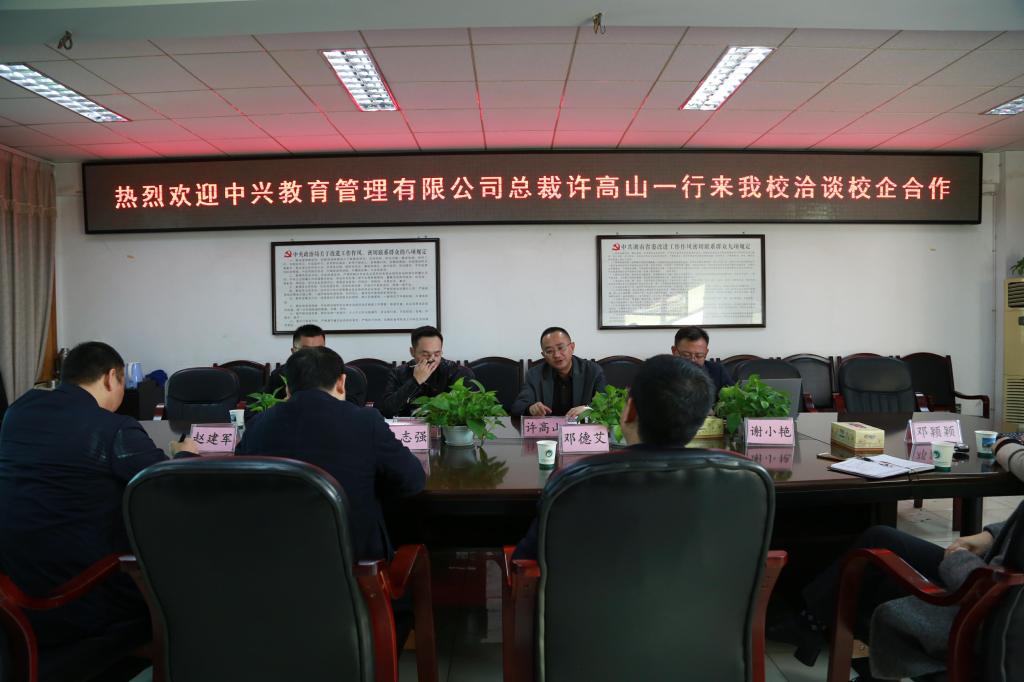 11月28日下午,中兴通讯教育管理有限公司总裁许高山、常务副总裁吕其恒、副总经理周中子、区域经理刘立佳一行四人来9999js金沙老品牌洽谈校企合作,9999js金沙老品牌校长邓德艾、就业与校企办主任赵建军、物流信息学院米志强院长、国际合作与继续教育学院谢小艳院长等接待了许高山一行。