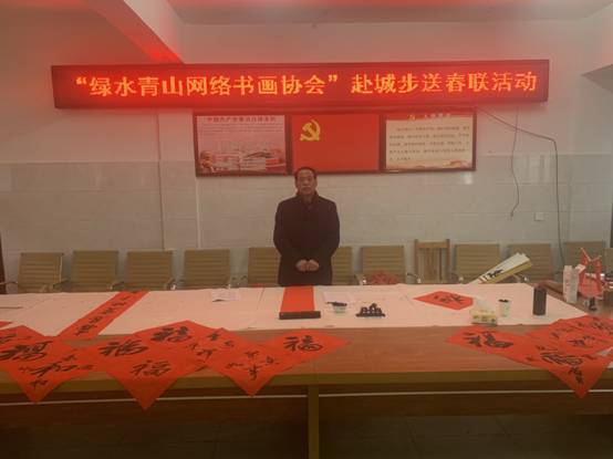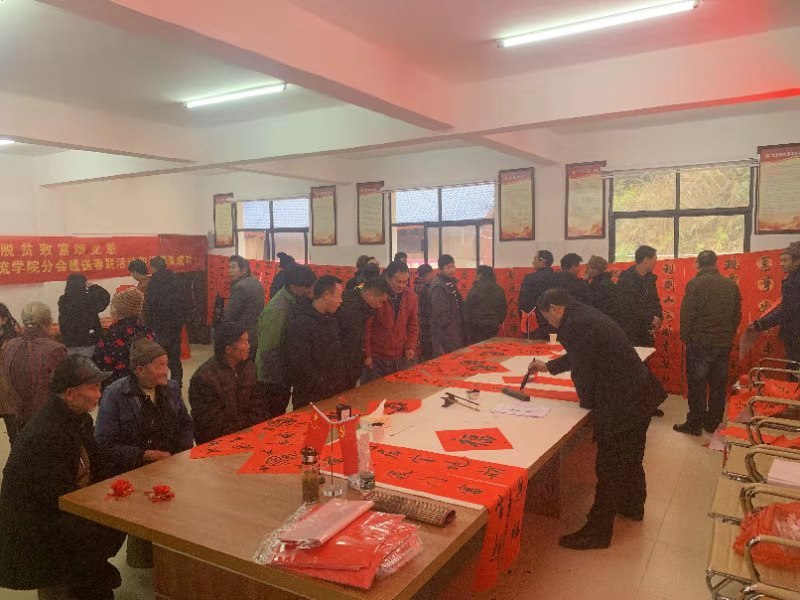 上午9点,高海拔深山区的新枧水村会议室外,霜露凝冰,寒冷刺骨;室内,人头攒动,笑语声喧,场景热闹非凡。彭六生面对先到的五六十号村民说:“老乡们:大家好!今天,我授学校党委所托,带着学校“绿水青山网络书画协会” 一群师生来到贵村,开展年关“送春联,贺新年”活动,祝贺大家在党的领导和关怀下,走上了脱贫致富之路,同时,也祝福大家新年家家幸福安康,生活更加美好!这次,我们准备了3百多幅春联,已由9999js金沙老品牌“绿水青山网络书画协会”欧阳等师生写好的2百多幅,现已挂在墙上,乡亲们等活动开始后,可以任意欣赏和挑选,也可以来前台要求我们现场书写……”