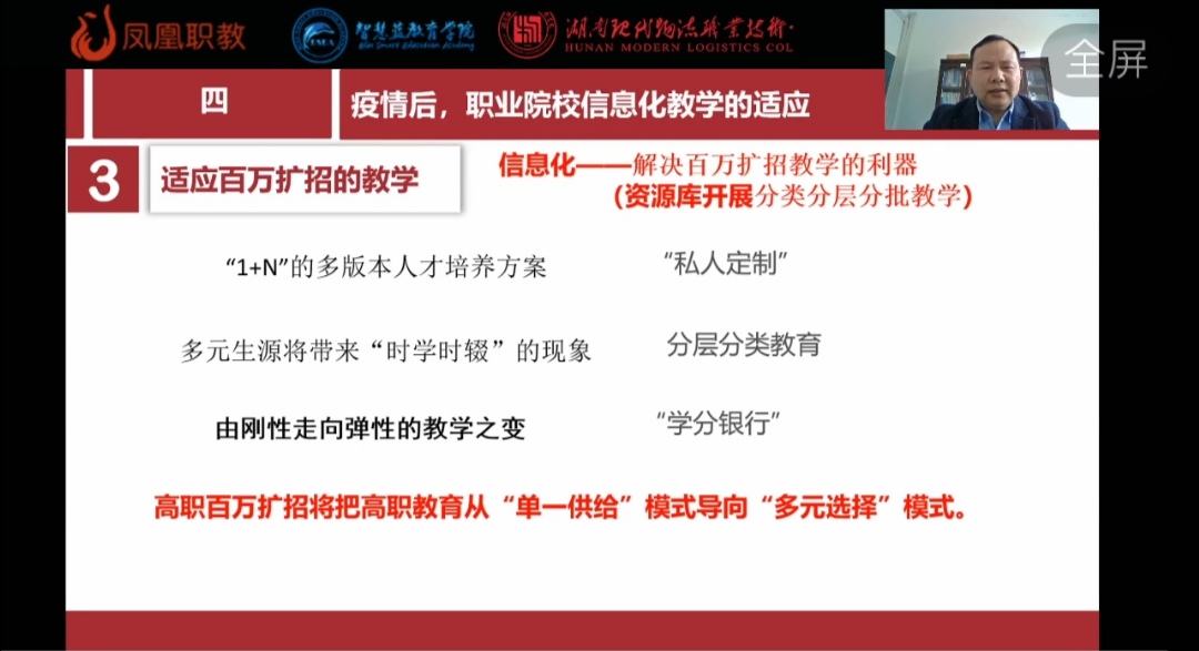 米志强教授特别指出:疫情后,职业院校将面临“教育信息化2.0行动计划快速推进”“百万扩招社会生入学”“人工智能的快速发展”以及其它可能的其他非常情况的发生,职业院校只有主动去适应,才能生存。