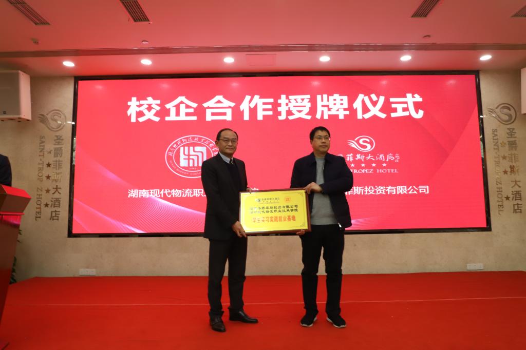 最后,邓德艾校长与李成文经理共同完成了为圣爵菲斯投资有限公司的“学生实习实践就业基地”授牌仪式。