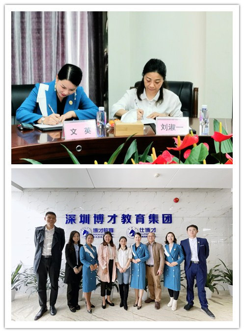 12月10日,来到深圳博才教育集团,在集团董事长文英的陪同下,双方在商务英语和空中乘务专业的学生实习就业进行了交流,达成合作意向,并签订了战略合作协议。
