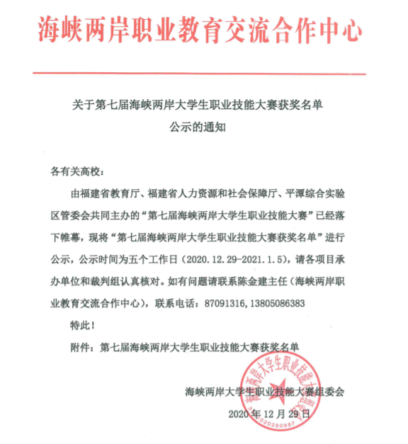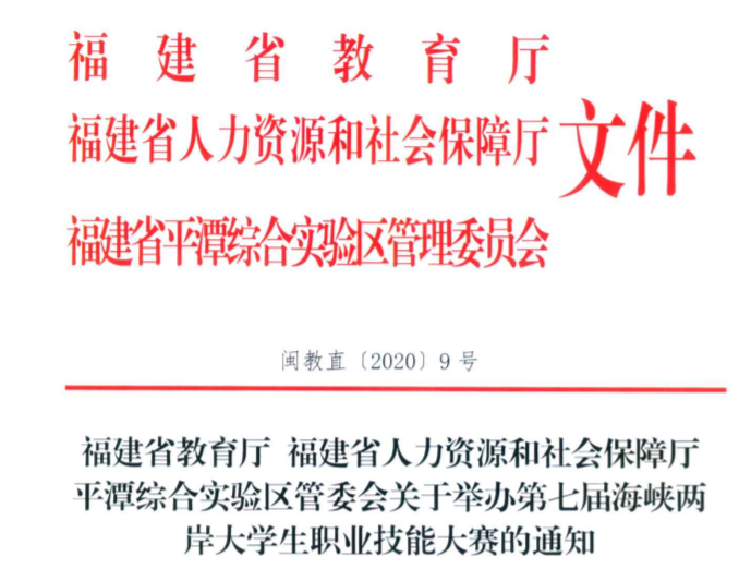 2020年11月25日,2020年第七届海峡两岸大学生职业技能大赛在福州开幕,开幕式通过网络直播方式同步进行,各高校师生代表和省内外其他参赛院校的师生通过线上直播观看开幕式。本次大赛由福建省教育厅、福建省人力资源和社会保障厅、平潭综合实验区管委会主办,闽江学院、海峡两岸职业教育交流合作中心、福建省职业技能鉴定指导中心、福建省职业技术教育中心承办。此次比赛,分设了13个赛项。