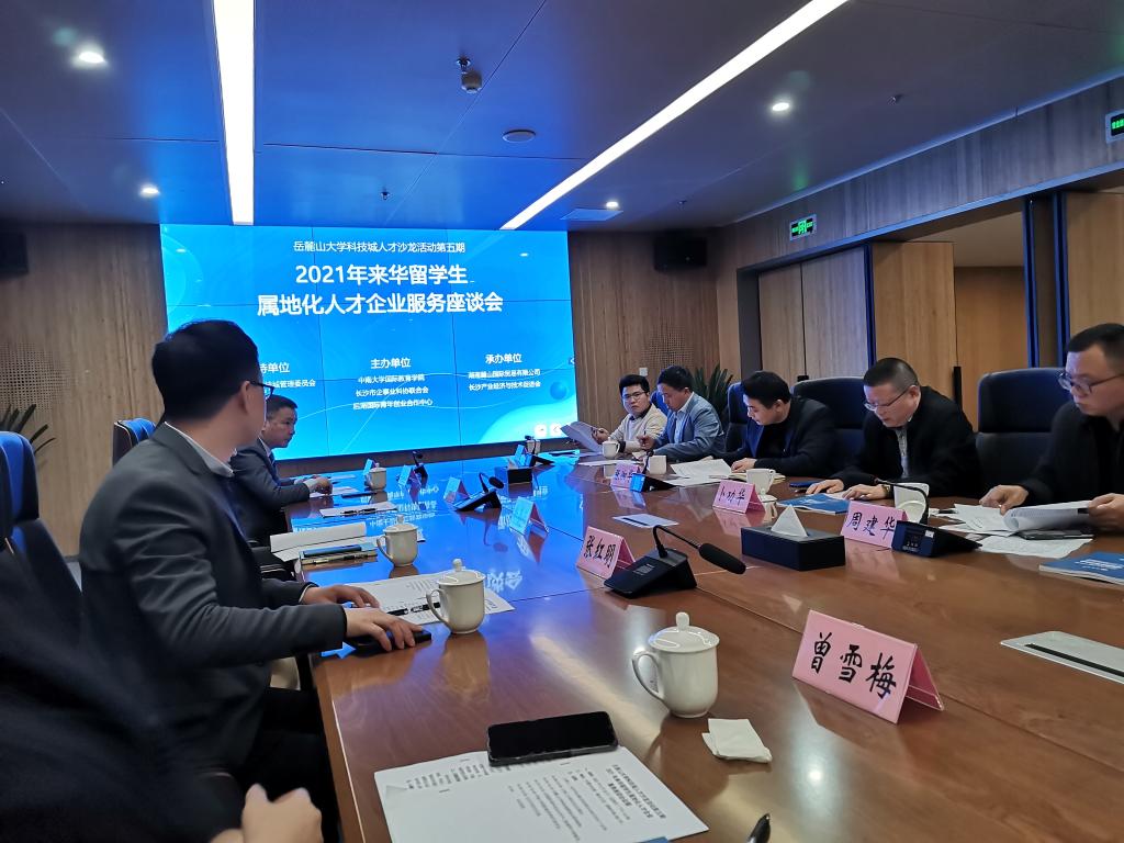 为了全面落实湖南“三高四新”战略,服务企业融入国际市场,推进“政产学研”合作,共建“智力丝路”。4月22日下午在岳麓科创港举行了岳麓区大学科技城人才沙龙活动第五期2021年来华留学属地化人才企业服务座谈会。企业国际留学生“属地化人才“服务是由长沙市企事业科联联合会联合后湖国际青年创业合作中心及中南大学等10所科研院校共同开展。