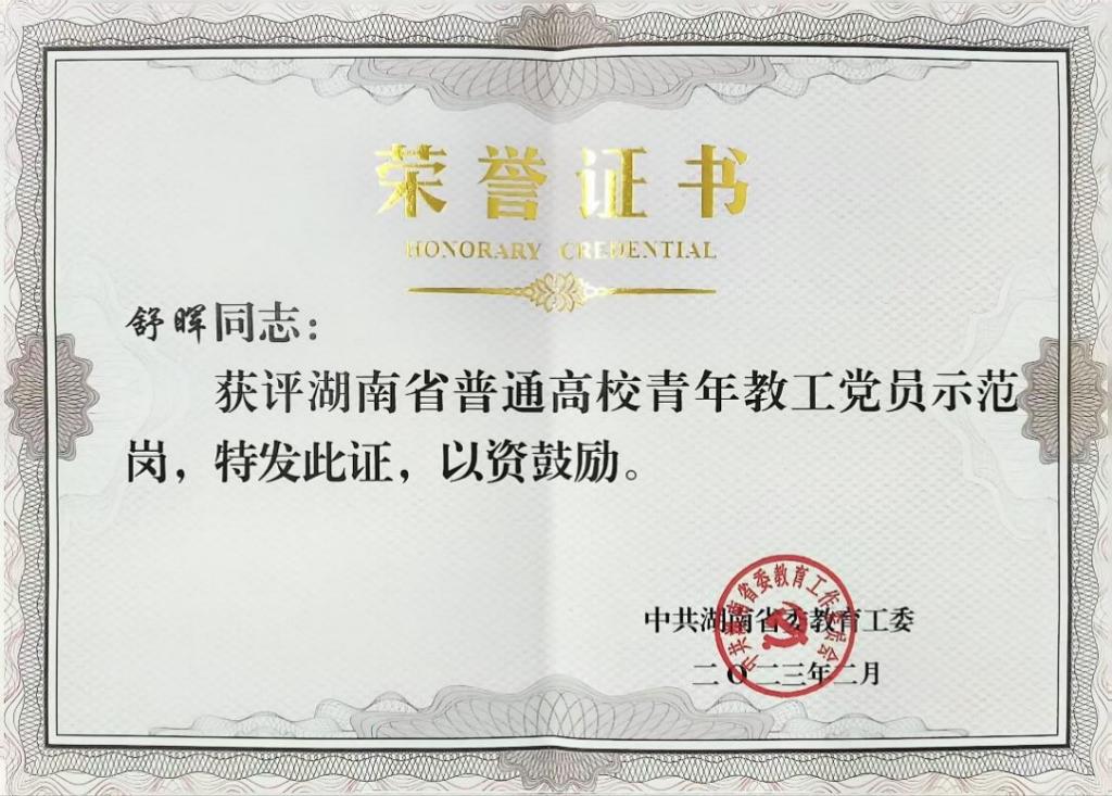 舒晖获评湖南省普通高校教师青年教工党员示范岗