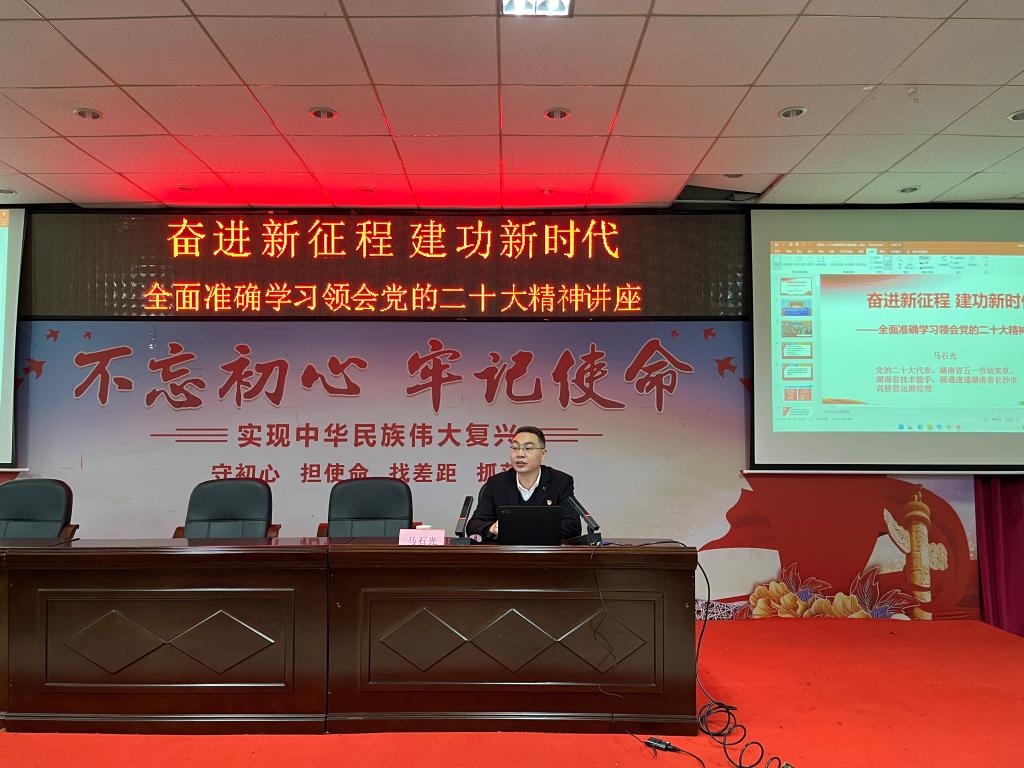 为深入学习宣传贯彻党的二十大精神,按照省委组织部印发“一课一片一实践”活动方案部署安排,11月29日下午,物流管理学院党总支在学校办公室四楼会议室开展“一课一片一实践”活动,活动邀请到党的二十大代表,湖南省五一劳动奖章获得者,圆通速递湖南省长沙市高桥营运部经理马石光作“全面学习深入领悟认真贯彻党的二十大精神”专题讲座。学校党委委员、副校长陈建华、物流管理学院院长曾明及学院全体教师和学生代表参加会议,学院党总支书记卜志纯主持会议。