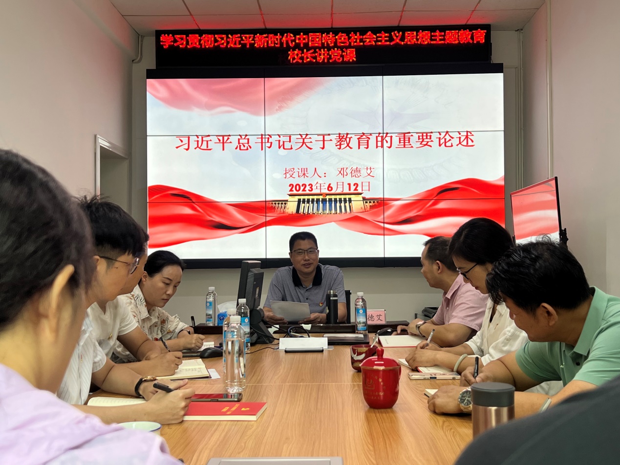 为深入推进学习贯彻习近平新时代中国特色社会主义思想主题教育,按照校党委关于主题教育的部署要求和教务科研督导党支部6月份“一课一片一实践”主题教育活动安排,2023年6月12日上午9点,在明德楼208室校长邓德艾以“深入学习习近平总书记关于教育的重要论述推动学校事业高质量发展”为题讲授主题教育专题党课。支部副书记米志强主持学习活动,教务科研督导党支部的全体党员和入党积极分子参加了学习。