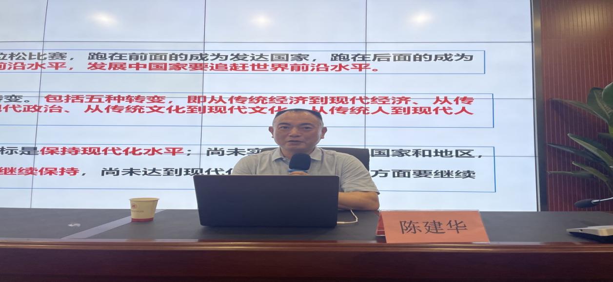 5月19日下午,学校党委委员、副校长陈建华在办公楼四楼会议室以“走好中国式现代化之路”为主题,为物流管理学院全体党员教师和入党积极分子上了一堂生动的党课。