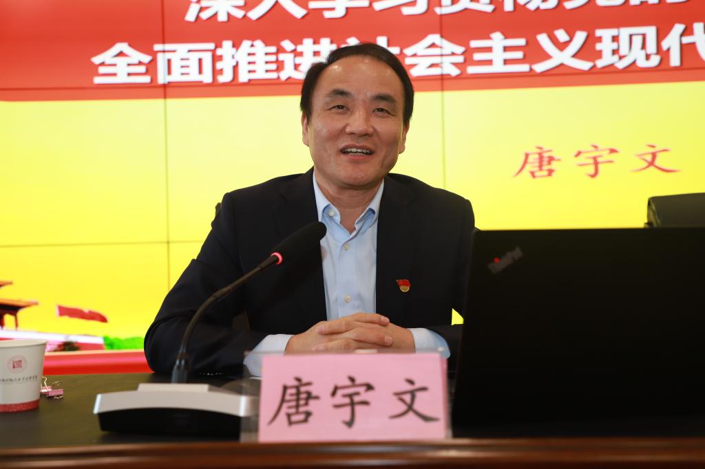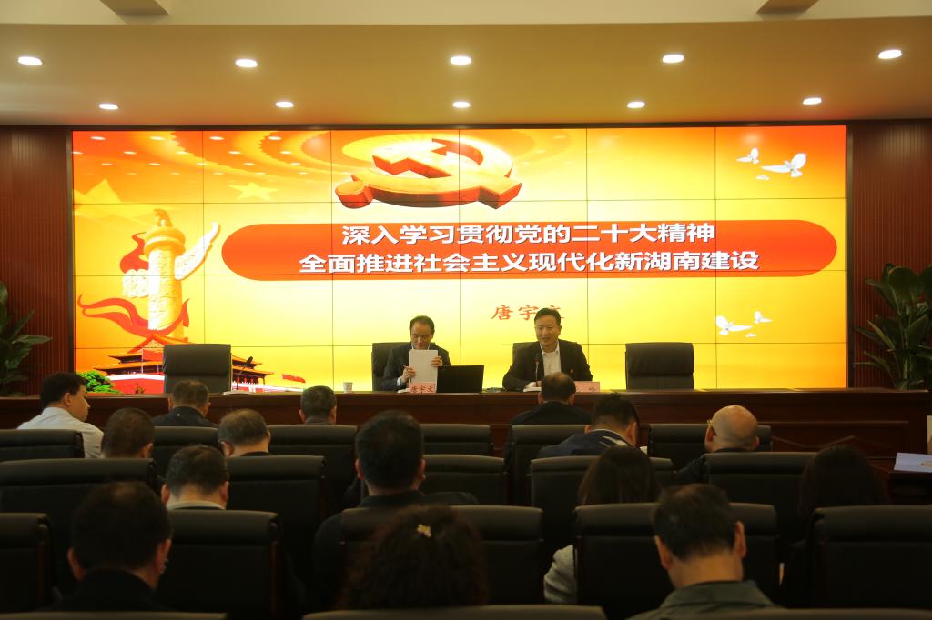 唐宇文以《学习贯彻党的二十大精神,全面推进社会主义现代化新湖南建设》为题,从“中国式现代化全面推进中华民族伟大复兴”和“全面建设社会主义现代化新湖南的目标与任务”两个方面作了一场精彩的辅导报告。报告从现代化的概念与内涵开讲,讲述了中国式现代化的特征,引用和领会习近平总书记关于中国式现代化的最新讲话,从历史、现实和未来三个维度看中国式现代化,特别是在“全面建设社会主义现代化新湖南的目标与任务”中,强调必须牢牢把握党的二十大精神,以湖南发展总体目标为指向,全面建设社会主义现代化新湖南:“主动服务和融入新发展格局,着力推动经济高质量发展”“大力实施科教兴省、人才强省、创新驱动发展战略,不断塑造发展新动能新优势”“坚持在发展中保障和改善民生,提高人民生活品质”“推动绿色发展,加快建设美丽湖南”“推进国家安全体系和能力现代化,加快建设更高水平的平安湖南”。报告战略任务具体清晰,数据详实、案例丰富、信息量大,全体与会者获益良多。