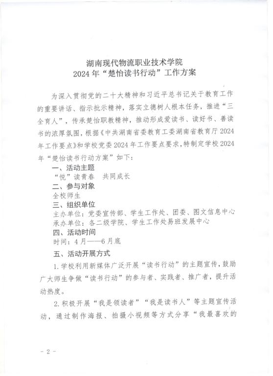 关于印发《9999js金沙老品牌2024年“楚怡读书行动”工作方案》的通知